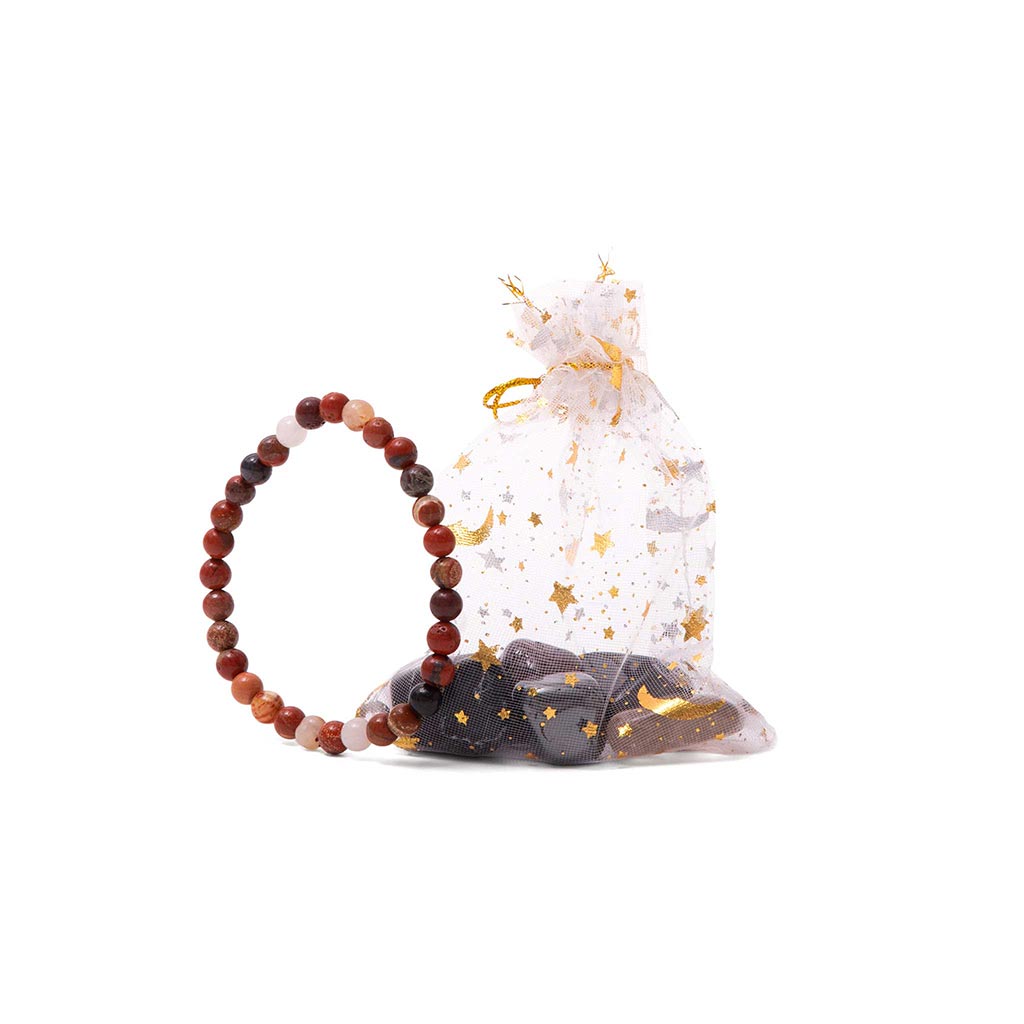Incluye un brazalete de jaspe rojo, una piedra conocida por su energía de arraigo, enfoque y seguridad personal. Además, integra un set de piedras energéticas en tono oscuro —como hematita y obsidiana— ideales para mantener la calma, proteger tu energía y fortalecer tu estabilidad emocional.