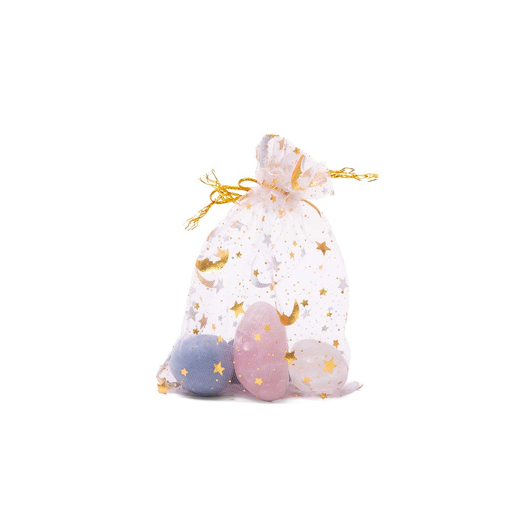 El Kit Infantil está diseñado para acompañar a los más pequeños con una energía suave, protectora y alegre. Incluye tres piedras/elementos en tonos pastel dentro de una bolsita de tul decorada con lunas y estrellas doradas, perfecta para regalar o colocar en su espacio personal.